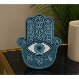 - Fincan ve fincan tabakları üzerinde soyut güneş ve ortasında Mavi - Turkuaz Nazar Boncuğu çalışması, kumlama tekniği ile porselen üzerinde dekorlanmıştır.