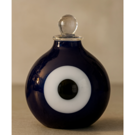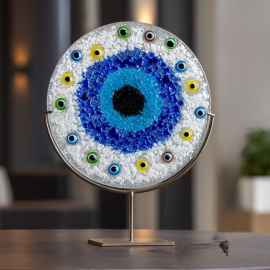 Geçmişten günümüze Nazar boncuğunun insanı kem gözlerden koruduğuna inanılır ve farklı aksesuarlarda kullanılır. Bir ok farklı kültürde ve dinsel inançta, göz figürü kötülükleri savan güçlü bir tılsım olarak kabul edilmiştir. Sıcak Cam Çalışması Nazar Boncuğu, Dekoratif Obje olarak tasarlanmıştır. Göz şeklini andıran nazar boncuğu motifleri kişinin dünyaya açılan penceresi ve her türlü iyi ve kötü düşüncenin ilk çıkış noktası olarak kabul edilir. Bu yüzden kötü bakışlı gözlerden korunmak amacıyla kullanılır ve kötü niyeti, nazarı emici özelliği olduğuna inanılır. Yaşam alanlarınızda tılsımıyla tüm kötülükleri savan ve iyiyi koruyan inanışıyla, dekorasyonunuza, hediyelerinize şıklık katmak için cam ustalarımız tarafından üretilmiştir.